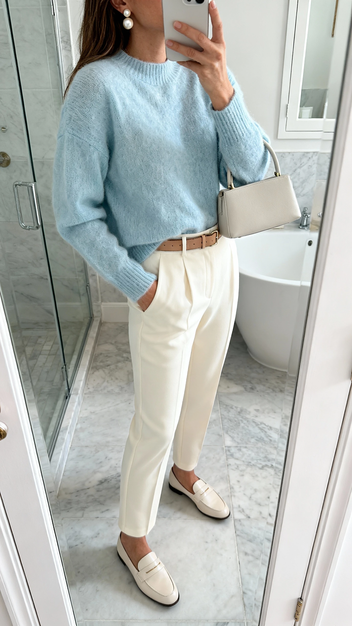 This is the quiet luxury uniform: an icy blue cashmere sweater and perfectly tailored trousers. It’s cozy but polished, and the texture does all the talking. Add subtle metallics and you’re set.