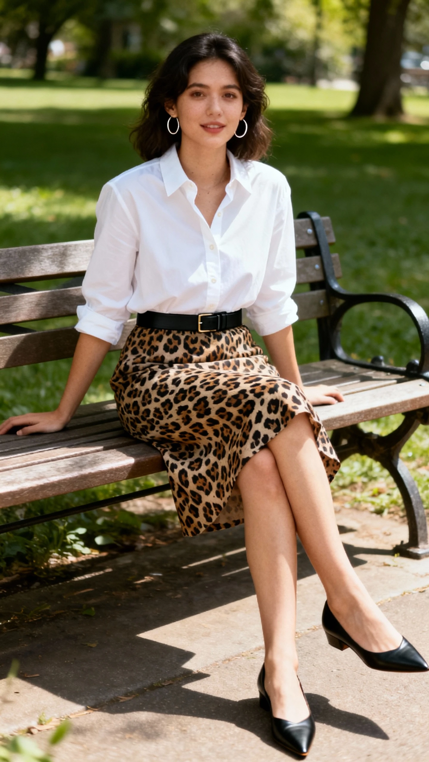 Crisp white shirt, leopard skirt, cinched waist—equals instant sophistication. This combo hits that modern-prep sweet spot and works year-round. It’s one of those outfits that looks tailored even when you threw it on in five minutes.