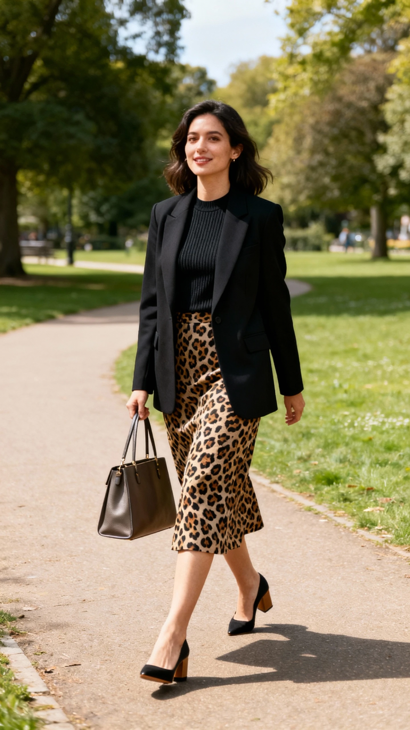 Yes, you can pair a leopard skirt with sneakers and still look luxe—if everything else is tailored. The high-low contrast makes it modern, and the right accessories push it into “expensive” territory. Comfort level: high. Style level: higher.