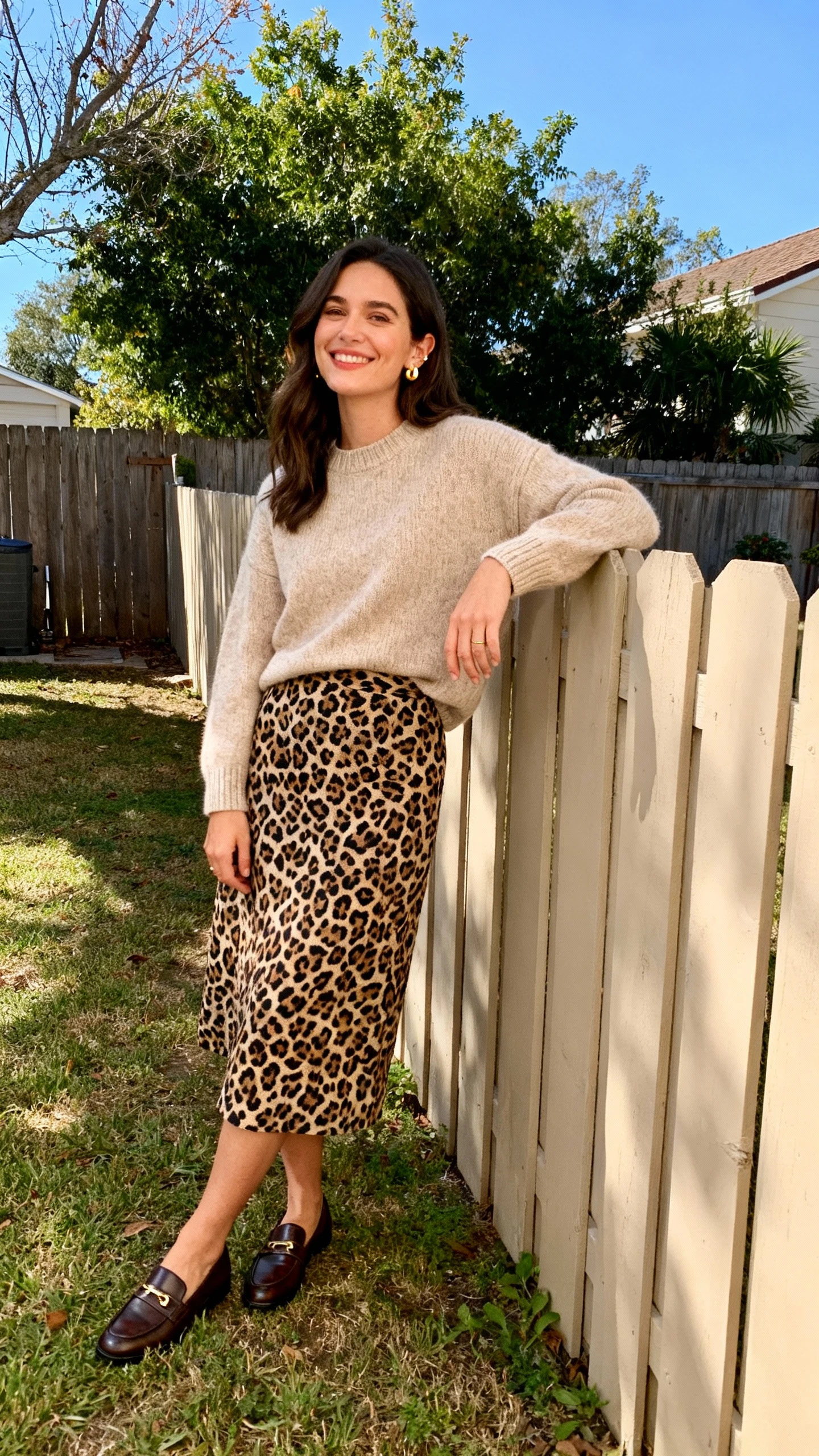 Nothing says “quiet luxury” like a soft cashmere knit paired with an elegant midi skirt. It’s cozy without slouching into lazy, and the textures play beautifully with the leopard print. Think understated, not underdressed.