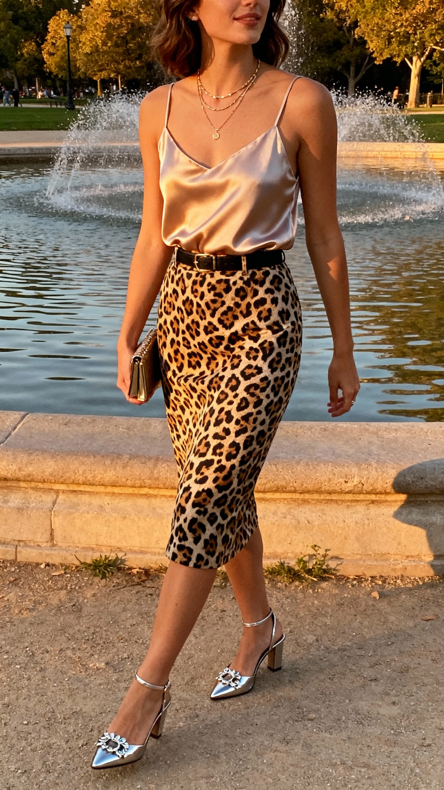 When you need your leopard skirt to serve full glamour, pair it with silk and a killer heel. The combination looks dressy without being overdone. It’s that perfect “cocktail but cool” energy.