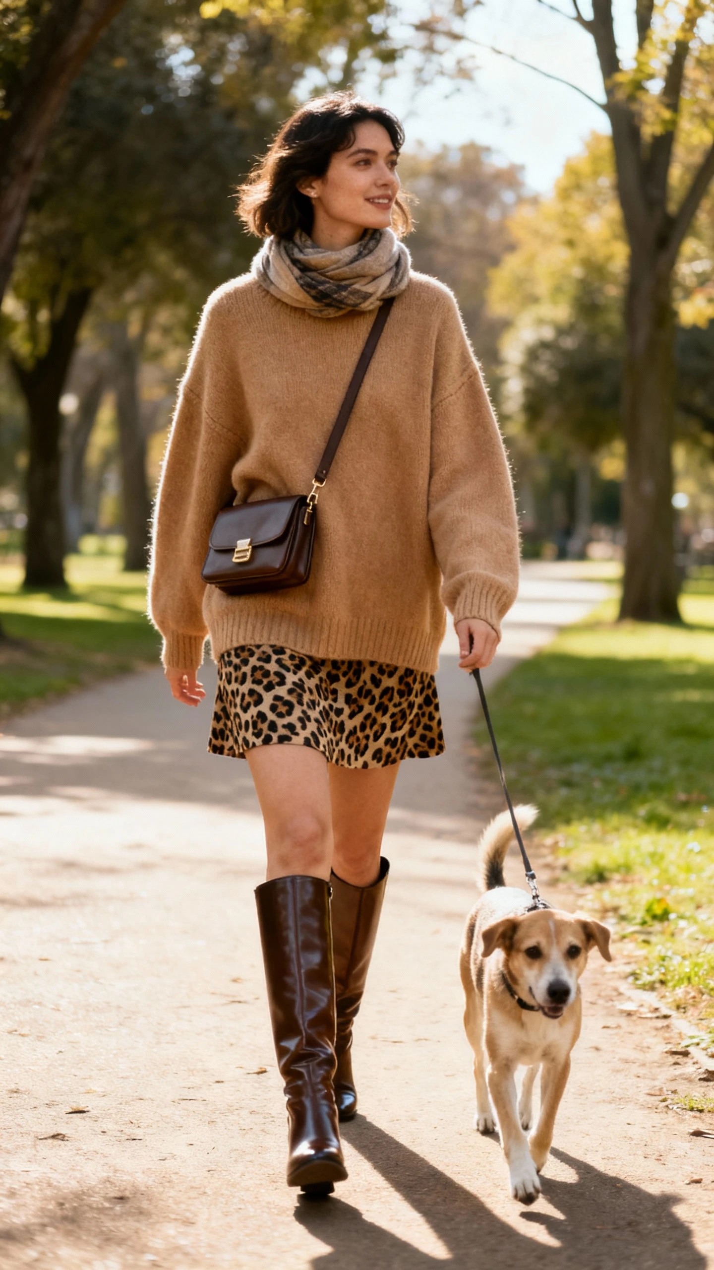 Chunky knit on top, sleek boots below, leopard in the middle—it’s texture heaven. This combo looks luxurious and keeps you warm without feeling bulky. It’s the kind of outfit that turns a chilly day into a runway moment.
