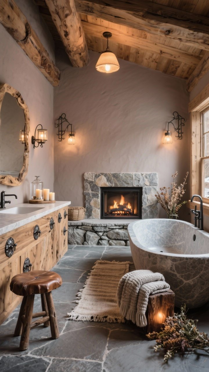 If space allows, add a sealed gas fireplace with a stone surround opposite the tub—pure luxury. Layer lighting with wrought-iron sconces, candles in hurricane glass, and a warm-dim ceiling light. Style with thick knit towels, a leather stool, a wool runner, and dried botanicals. You’ll want to winter here forever.