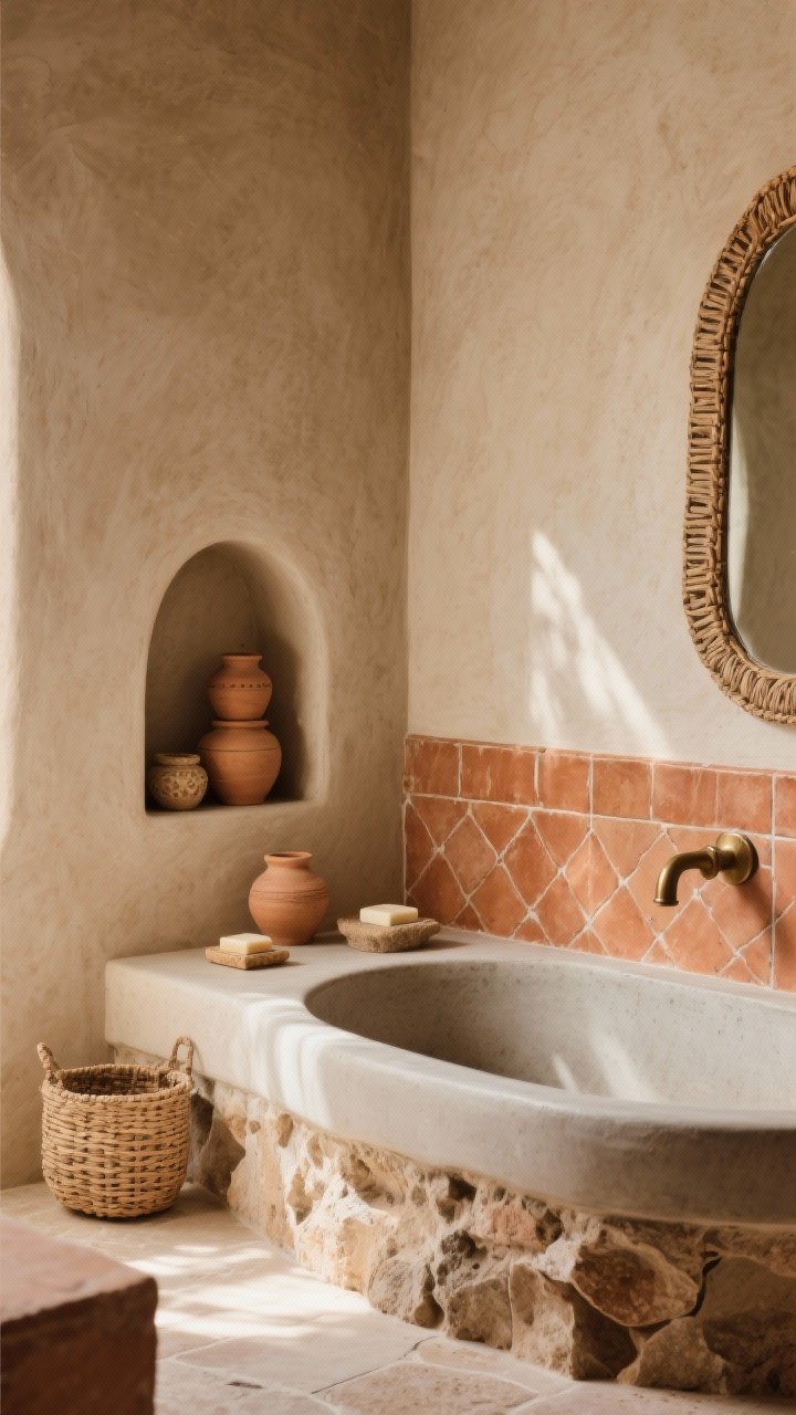 Opt for a sculpted concrete tub with rounded edges and brushed bronze fixtures that patina. A niche with stacked clay jars and handmade soap adds artisan charm. Keep mirrors arched, baskets woven, and textiles in earthy stripes. A potted olive tree seals the Mediterranean-spa vibe.