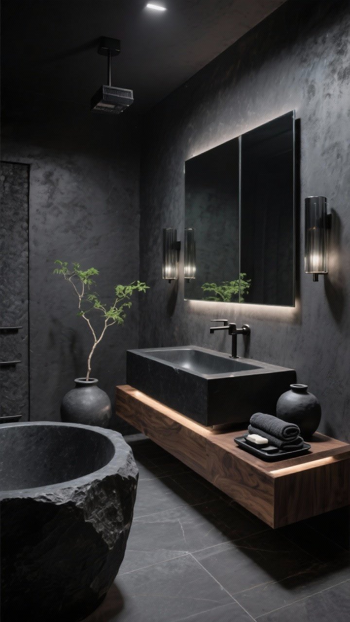 Moody, sculptural, and incredibly chic. Start with charcoal plaster walls and a floor of large-format graphite porcelain slabs with minimal grout. The centerpiece is a monolithic black stone tub with a matte finish, paired with a sleek ceiling-mounted tub filler in blackened steel.