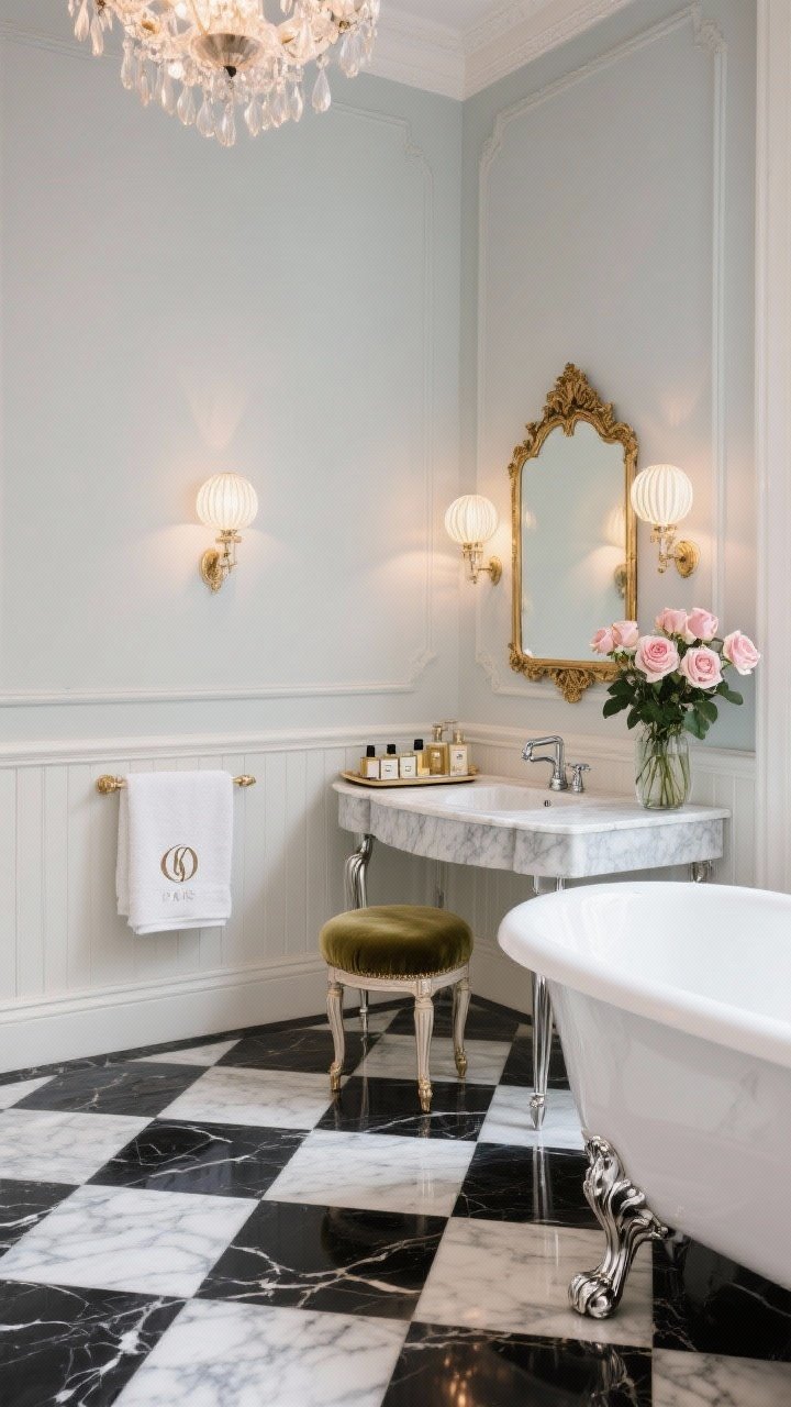 If a hotel in the 8th arrondissement had a private spa, it would look like this. Floors in classic black-and-white marble checkerboard, paired with walls in glossy ivory wainscoting and upper walls painted a pale greige. The showstopper? A clawfoot tub with polished nickel feet and a vintage-style telephone faucet.