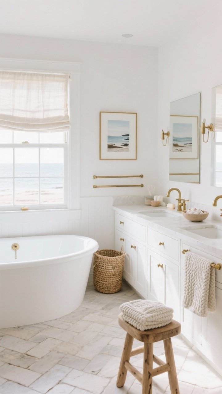 For texture, bring in a whitewashed oak stool, waffle-knit towels, and a woven seagrass hamper. The floor is pale tumbled limestone, laid in a soft herringbone. Above the tub, a large window with gauzy linen Roman shades filters light like a sunrise. Finish with a coastal photograph in a thin brass frame and a bowl of sea salt soaps on the vanity.