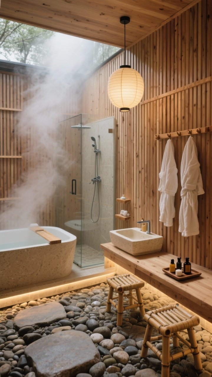Keep the vanity low and long in rift-sawn oak with integrated pulls and a trough sink in creamy limestone. Lighting is soft and indirect—think concealed LEDs under the bench and a paper lantern overhead. Finish with bamboo stools, a tray of essential oils, and linen robes on wooden pegs. Everything whispers, nothing shouts.