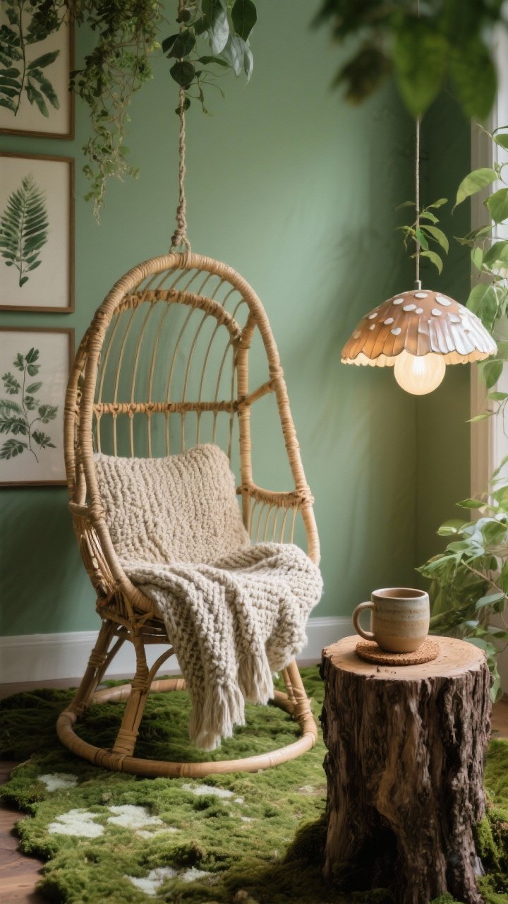 This corner feels like a forest clearing at dawn. Paint the backdrop a **soft eucalyptus green**, then layer **woven textures**—a **rattan hanging chair**, a **chunky knit throw**, and a **mossy rug** with subtle tonal shifts.