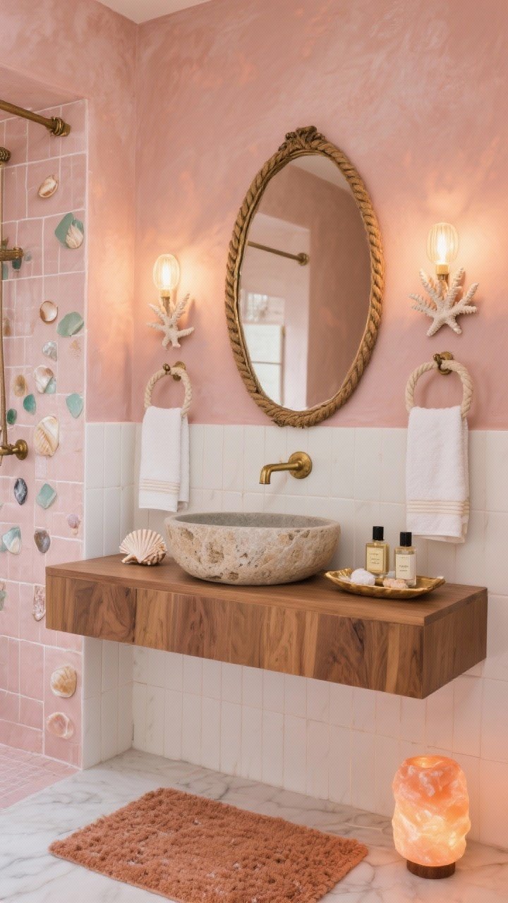 This bathroom feels like a sunken treasure site bathed in rose-gold light. Use **sea-glass tiles** in blush and shell white for the shower, paired with a **matte clay-pink wall** paint.
