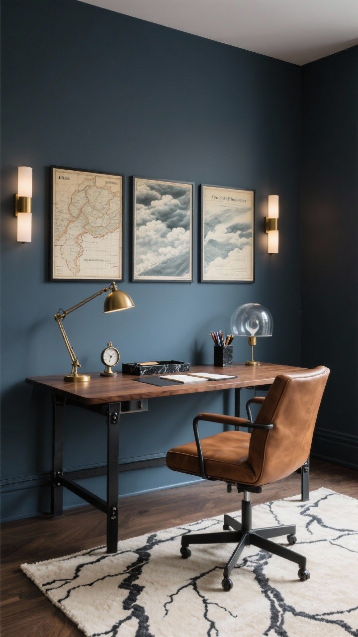 Choose a **walnut writing desk** with black metal hardware and pair it with a **tobacco leather chair**. On the wall, hang a **triptych of vintage storm maps** or abstract cloud studies in muted tones.