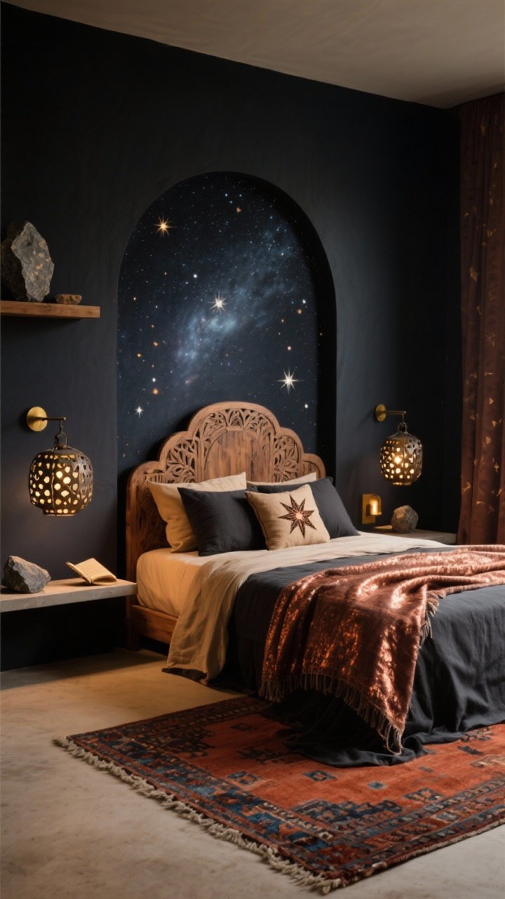 Imagine wandering deserts under galaxies. This bedroom layers **inky midnight walls** with **sand and rust textiles** to balance cosmic and grounded.