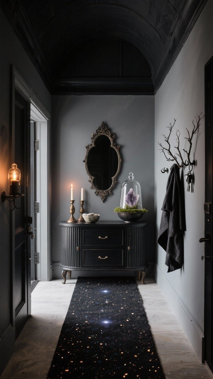 Your foyer becomes a flicker-lit passage to another realm. Paint the walls **soft charcoal** and the ceiling **ink black** to create a cocoon. Lay a **narrow runner** in **galaxy speckle**—black with tiny metallic flecks.