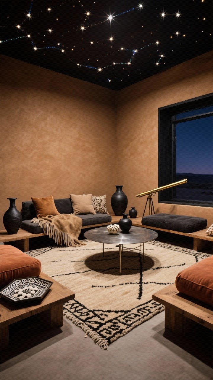 This lounge is spacious, low-slung, and grounded by earth tones with celestial accents. Start with **warm camel walls** and **charcoal trim** for contrast. Lay a **massive flatweave rug** in oatmeal with black tribal linework.
