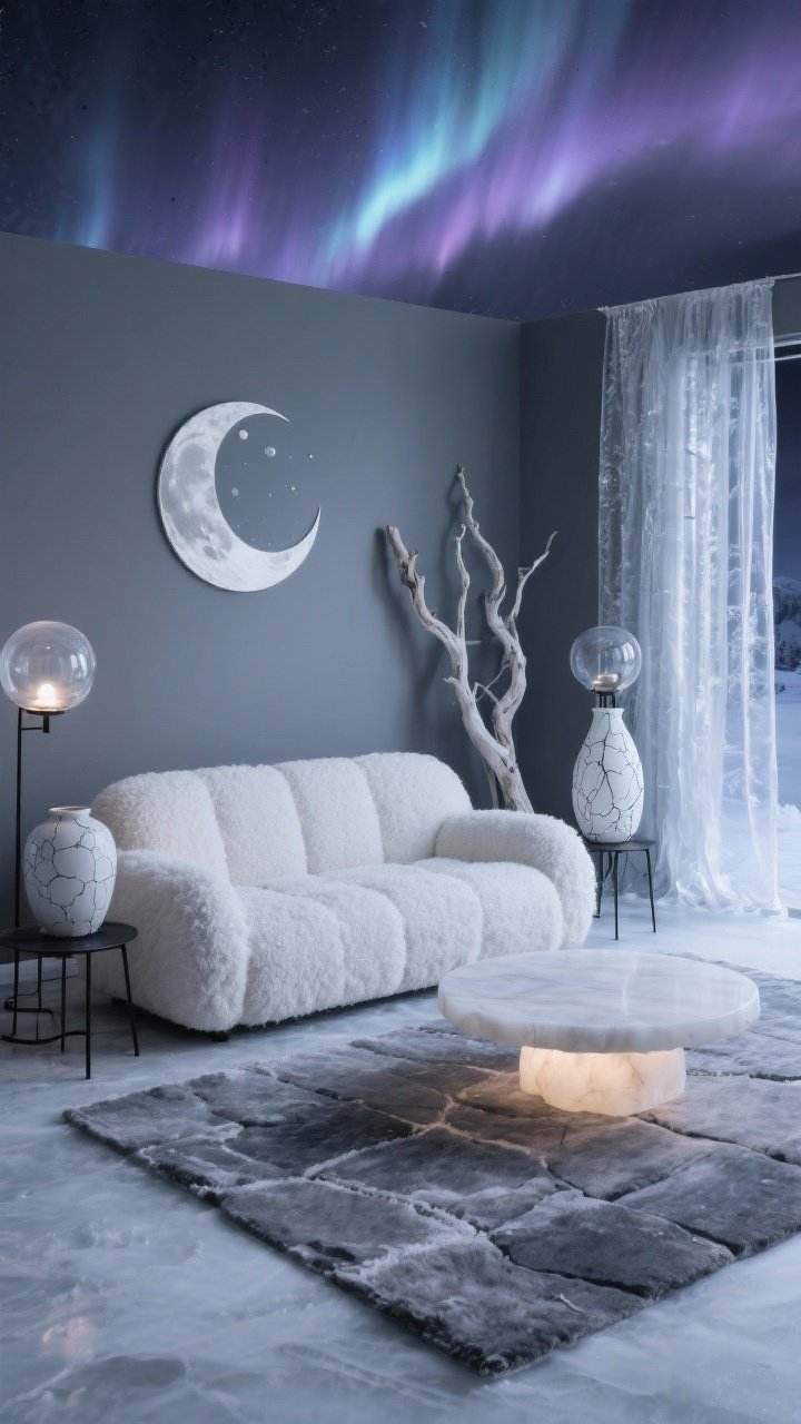 This living room looks like midnight on an icy plain—calm, luminous, and serene. Start with a palette of **stormy grays**, **glacier whites**, and a whisper of **blue-lilac** to cool the space.