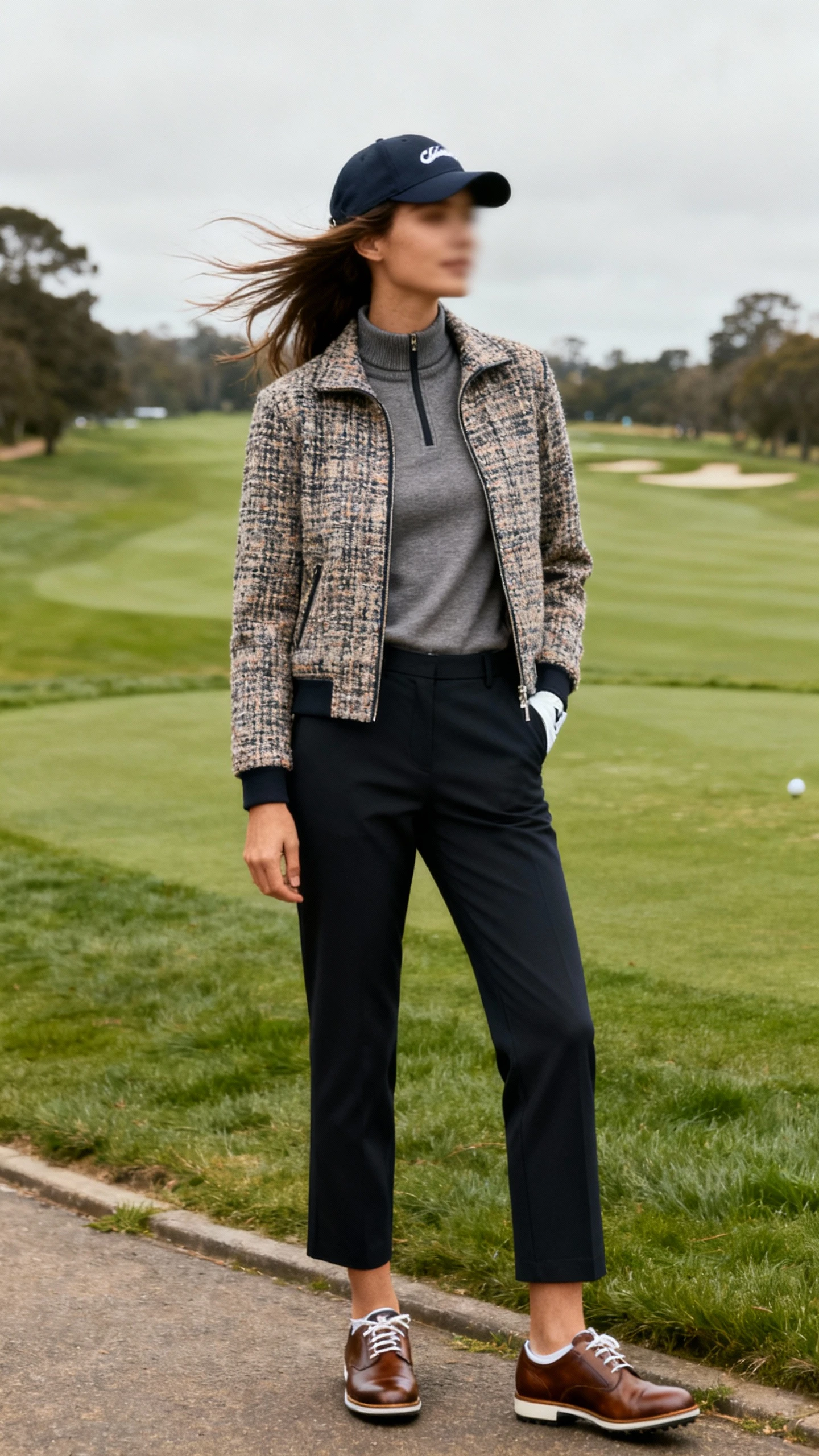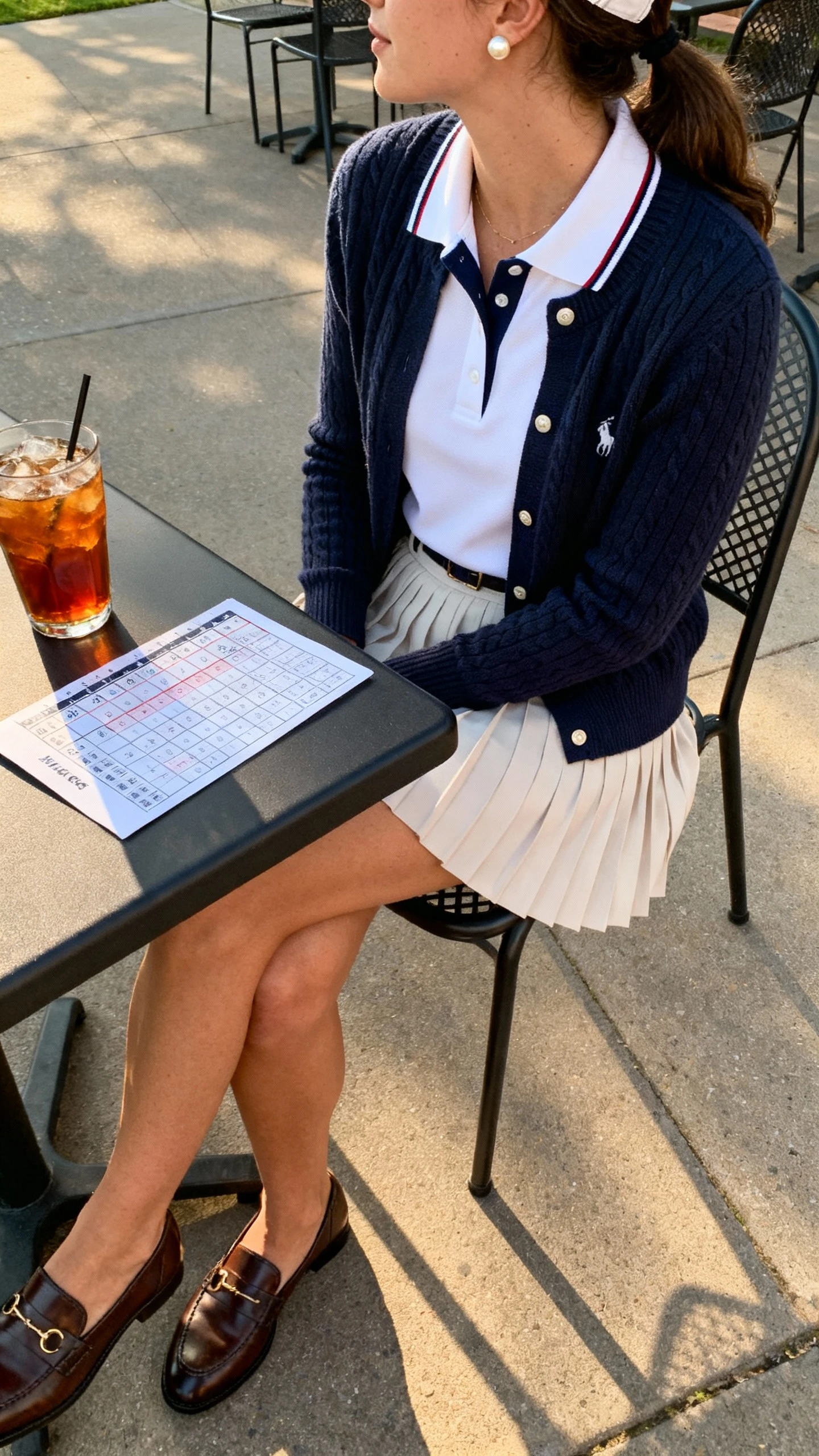 If you want “I know the starter by name” energy, go cardigan. A fine-gauge cardigan over a fitted base keeps it graceful and timeless. Add a pleated bottom and you’re suddenly in a vintage tennis postcard—on a golf course.