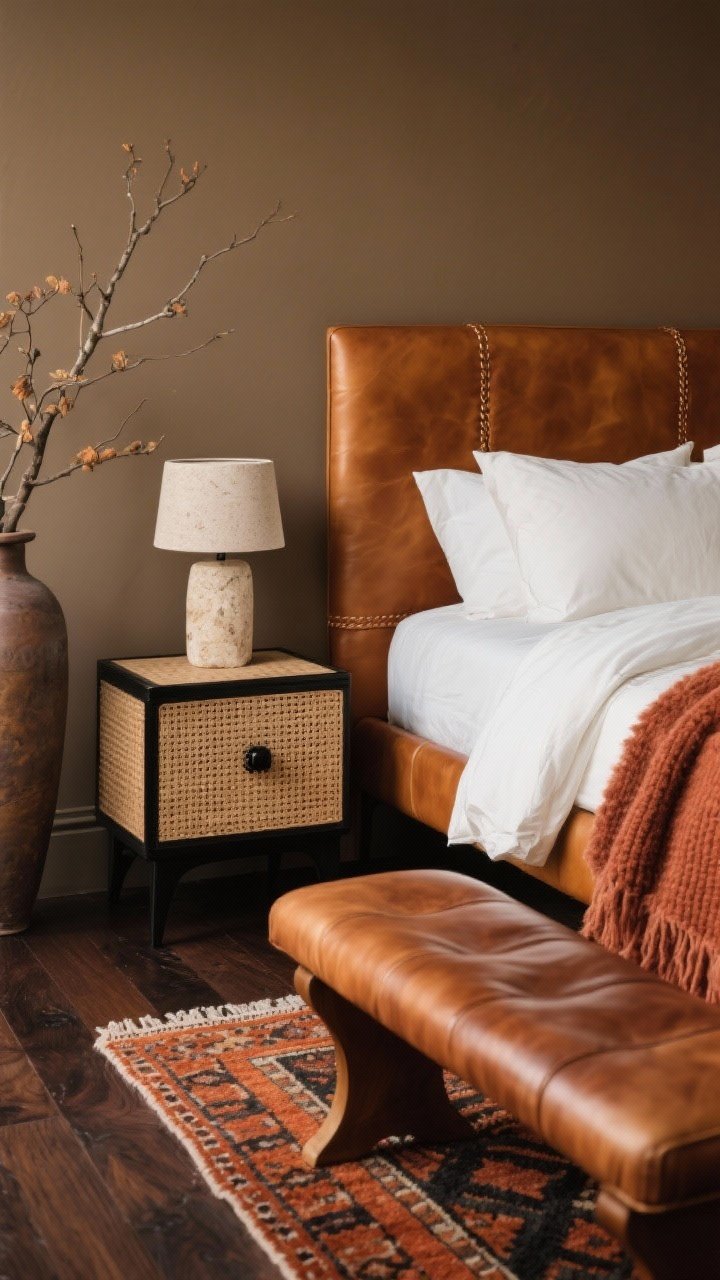 Layer textural linen bedding in warm white, plus a nubby wool throw in rust. Nightstands can be ribbed wood or cane-front, topped with stone lamps in travertine. Add a handwoven kilim in terracotta and charcoal to pull everything together.