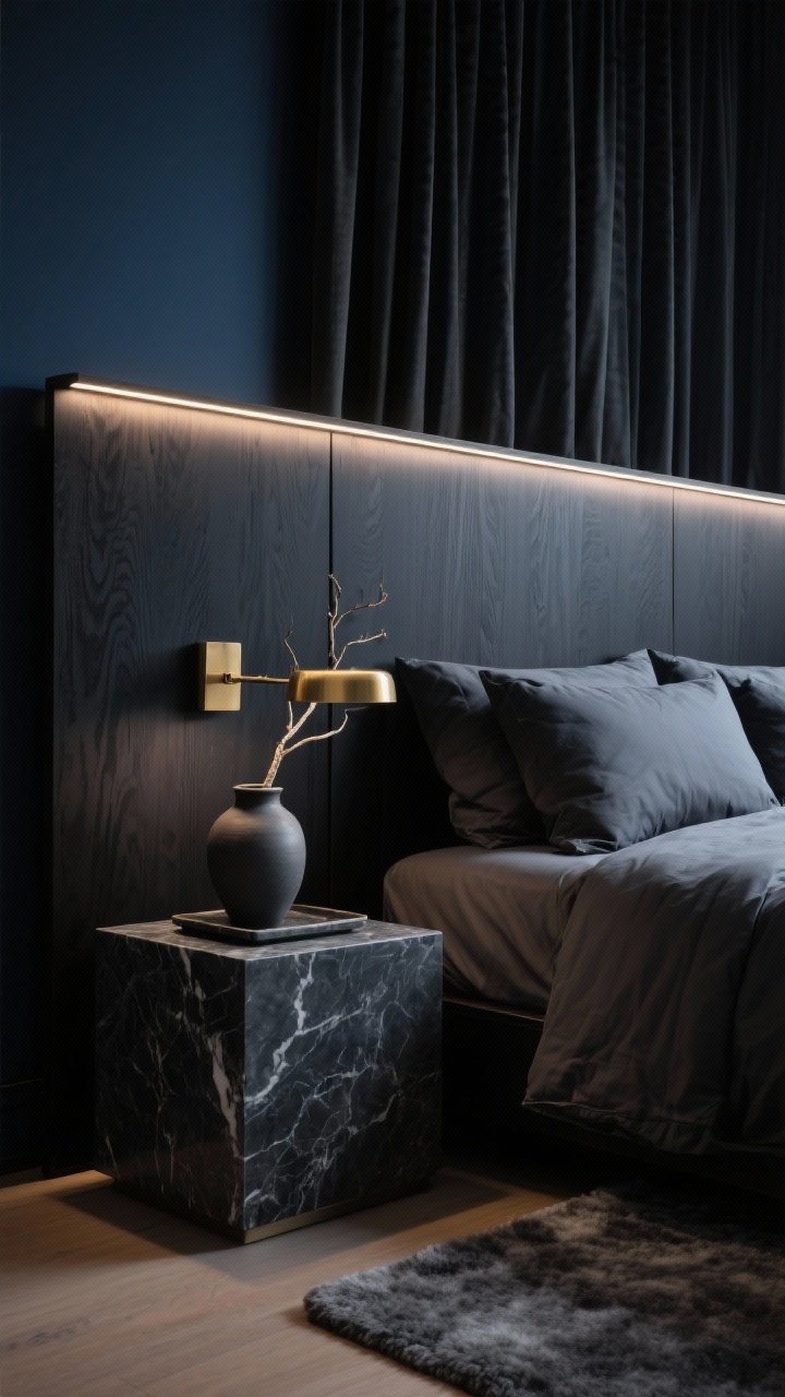 This one brings drama, but make it whisper. Paint walls a deep charcoal or ink blue with a velvety matte finish. The bed? A slab-style headboard in black-stained oak or leather.