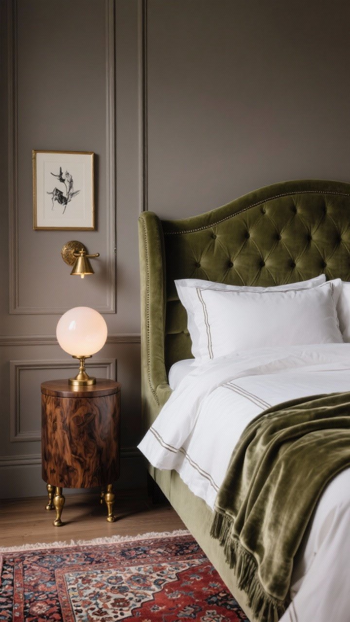Old-world bones with contemporary polish. Paint walls a sophisticated smoky taupe and outline door frames in a slightly deeper shade. A tufted wingback headboard in moss velvet sets the tone.