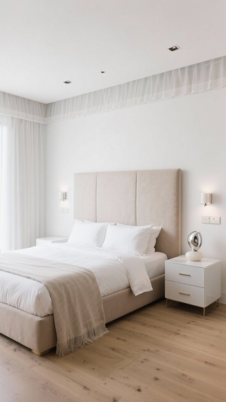 The bed is fully upholstered with a tall, flat headboard. For nightstands, choose lacquered cubes with hidden drawers. Lighting is integrated—think hardwired sconces with dimmers and recessed ceiling spots.