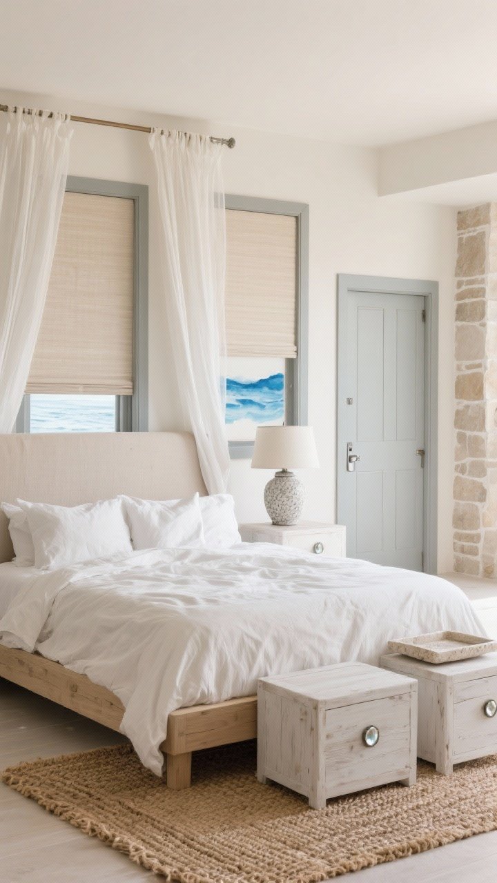 Texture does the heavy lifting here. Choose gauzy white drapes layered over solar shades. Add a woven jute or seagrass rug beneath the bed. Nightstands in whitewashed wood with mother-of-pearl knobs feel quietly glamorous.