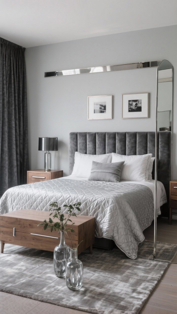 This look is about pristine tailoring and barely-there shine. Go for layered grays—cool dove walls, deeper charcoal drapes, and a platinum quilted coverlet.