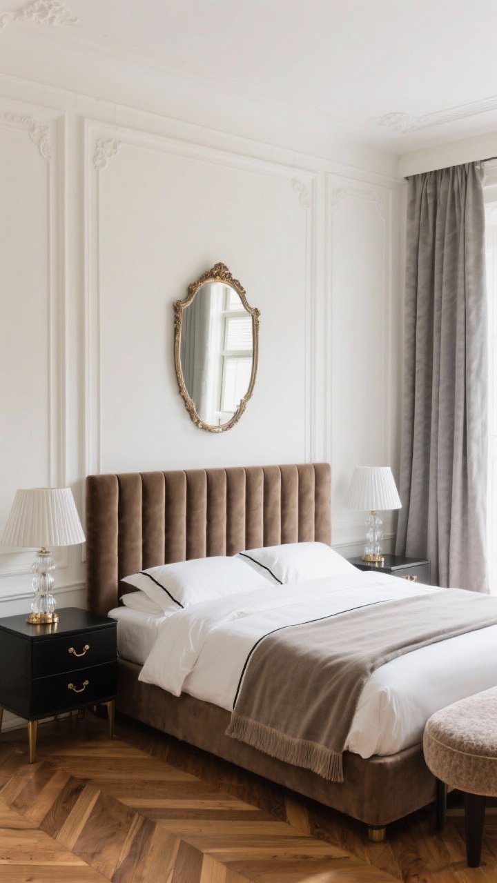 Bring in a velvet channel-tufted headboard in sable or mocha. Pair with blackened bronze nightstands and fluted glass table lamps. A chevron wood floor in a warm mid-brown adds European romance, offset by long, puddle-length linen drapes in stone.