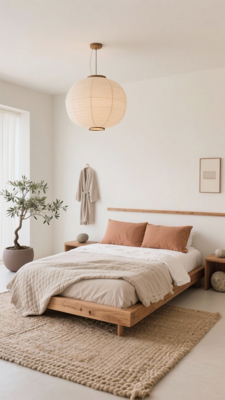 Lighting stays spare and sculptural. Choose rice paper pendants or a single large shoji-style flush mount. Add a simple oak rail for hanging robes or art, and tuck a bonsai or olive tree in a matte taupe planter. No clutter, just quiet form and function.