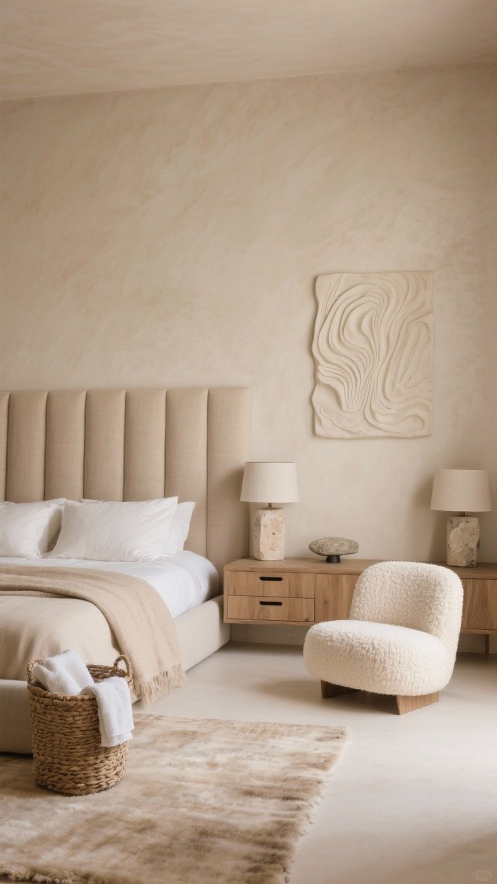 Anchor the space with a padded panel headboard upholstered in flax. Nightstands go sculptural in travertine, paired with linen-shaded lamps. Incorporate storage with a floating oak console and hidden drawers.