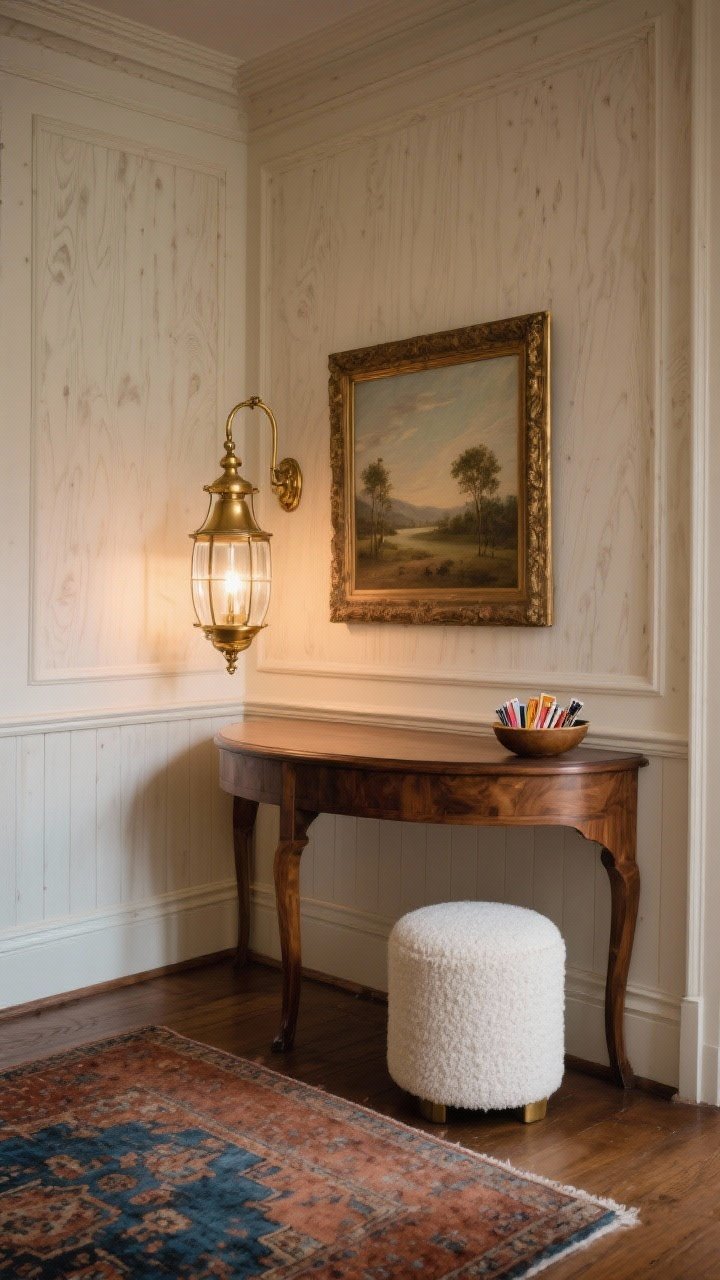 A refined antique brass picture light washes over a muted landscape painting, while a demilune console in oak sits beneath, curved and gracious. A Persian runner in faded rust and blue anchors the floor like it’s always been there.