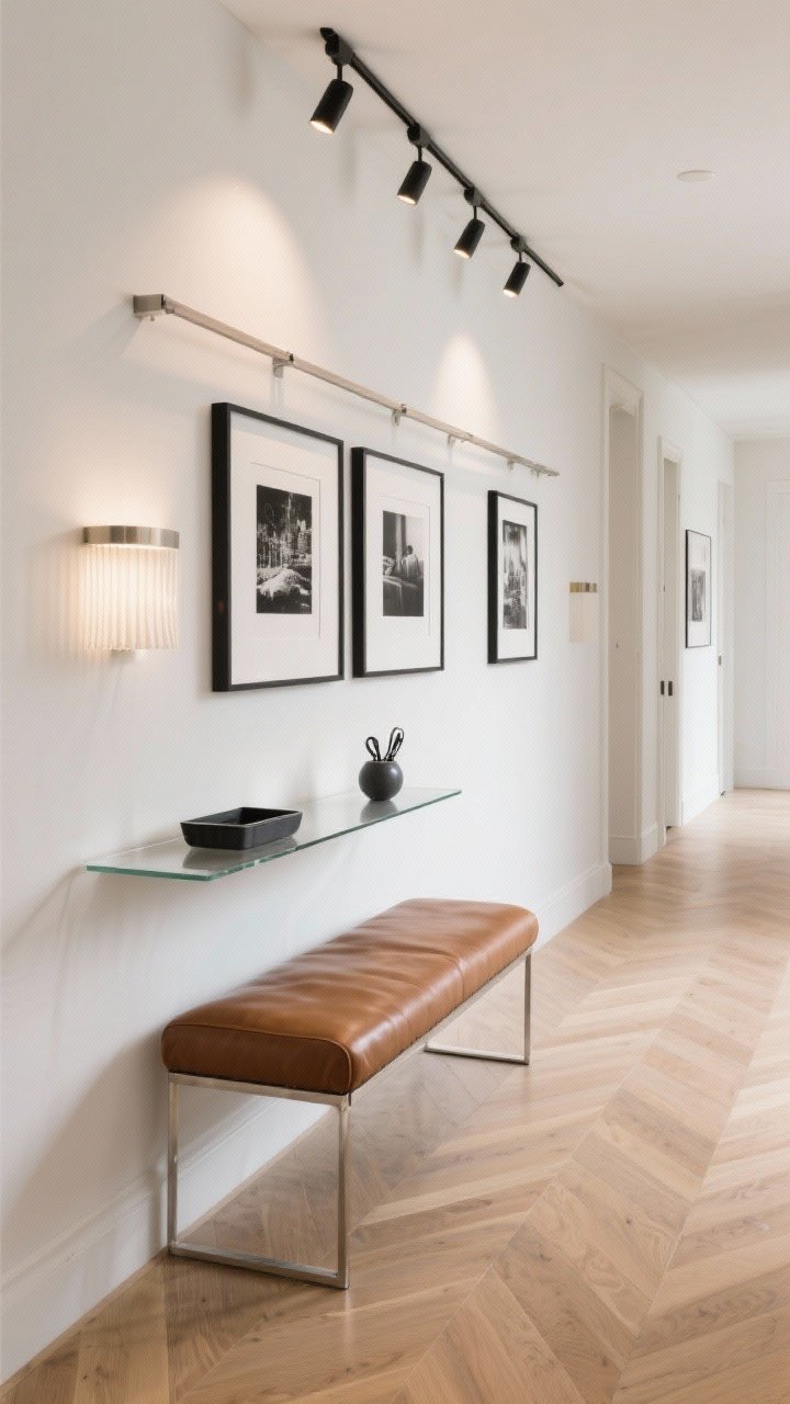 A slim steel console with a fluted glass shelf keeps it sculptural without bulk. For lighting, use micro spotlights to graze the frames and a narrow linear sconce for ambient illumination.