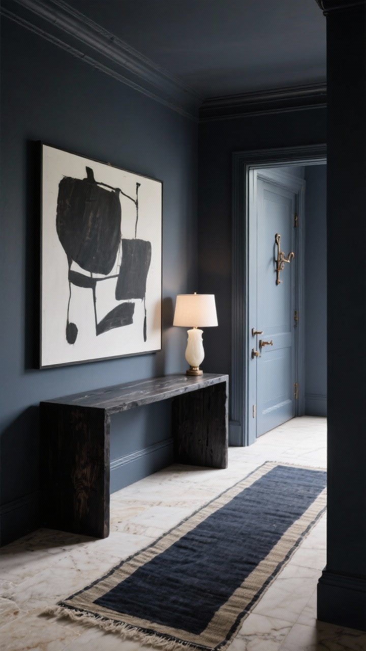 If you love cocooning drama, paint the entry a deep charcoal blue-gray in matte. Contrast with antique bronze accents and creamy stone underfoot.