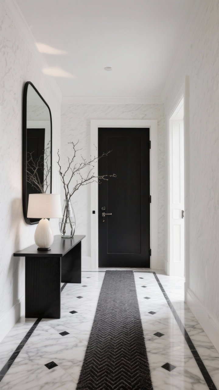 This entryway leans into a serene black-and-white palette with soft grays layered in. Picture a floor of honed Calacatta marble tiles laid in a large-scale diamond pattern, framed by a thin black border for definition.