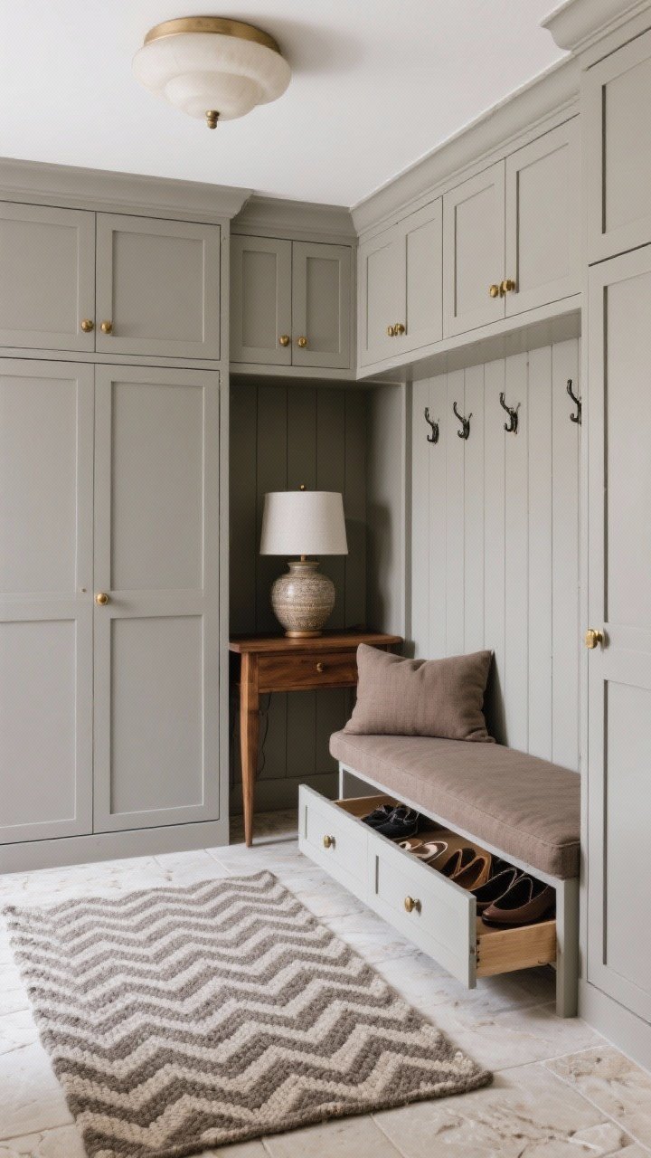 For families who want beauty and function, this entry hides everything in plain sight. Built-ins in painted mushroom gray wrap one wall with inset shaker doors and antique brass knobs.