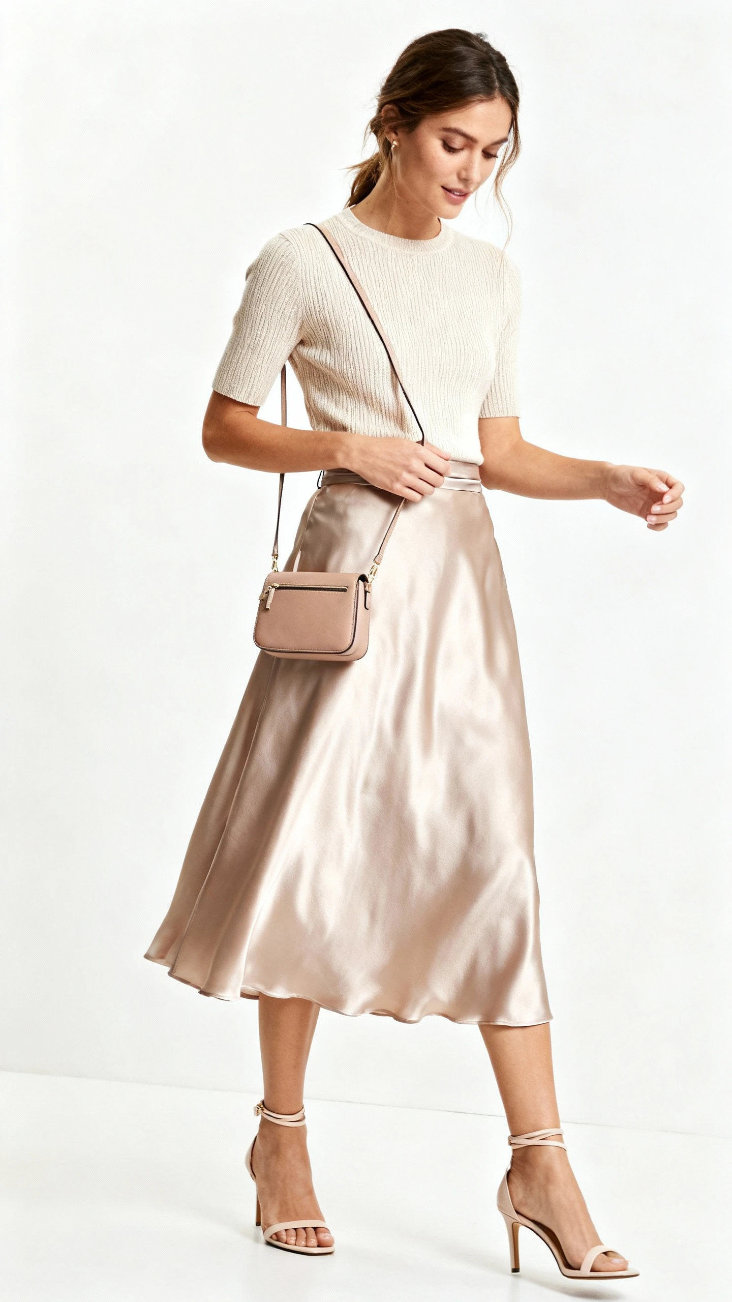 - Midi skirt in satin, pleated chiffon, or softly structured cotton