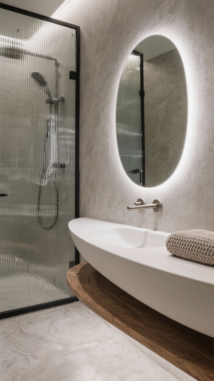 7. Sculptural Bathroom With Microcement and Rippled Glass