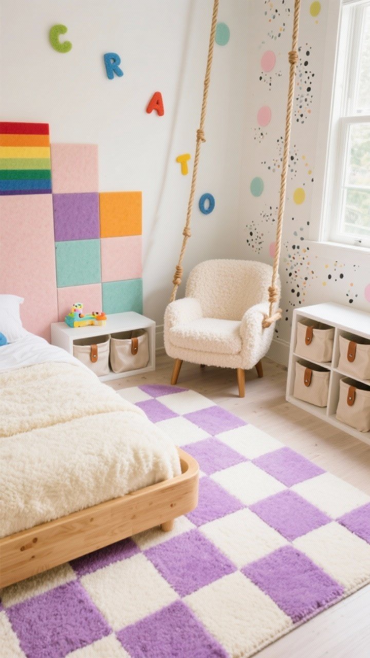 The rug is the star: a plush checkerboard in cream and pastel lilac. Add a low maple platform bed with rounded edges, a bouclé reading chair, and a hanging macramé swing for play.
