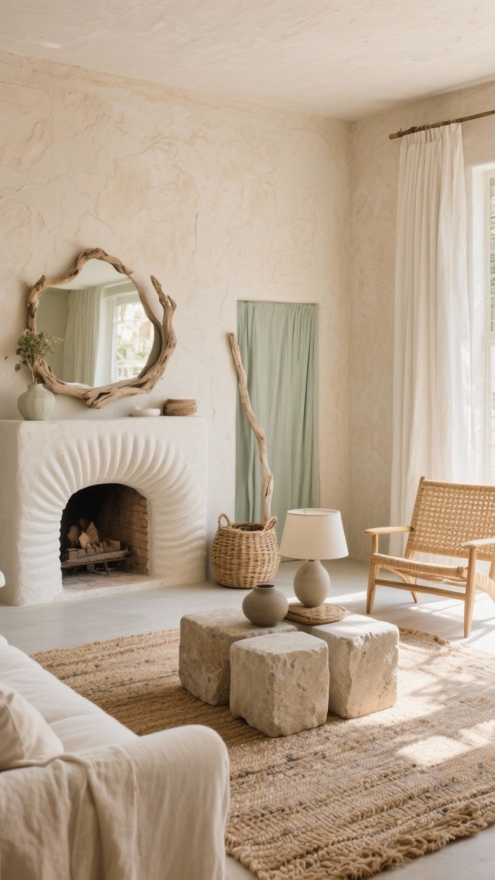 Anchor the space with a low, linen-slipcovered sofa in ecru and layer in oversized jute and wool rugs for grounded texture. Add a rattan-arm lounge chair, a stone cube coffee table, and a giant driftwood mirror that bounces light without feeling flashy.