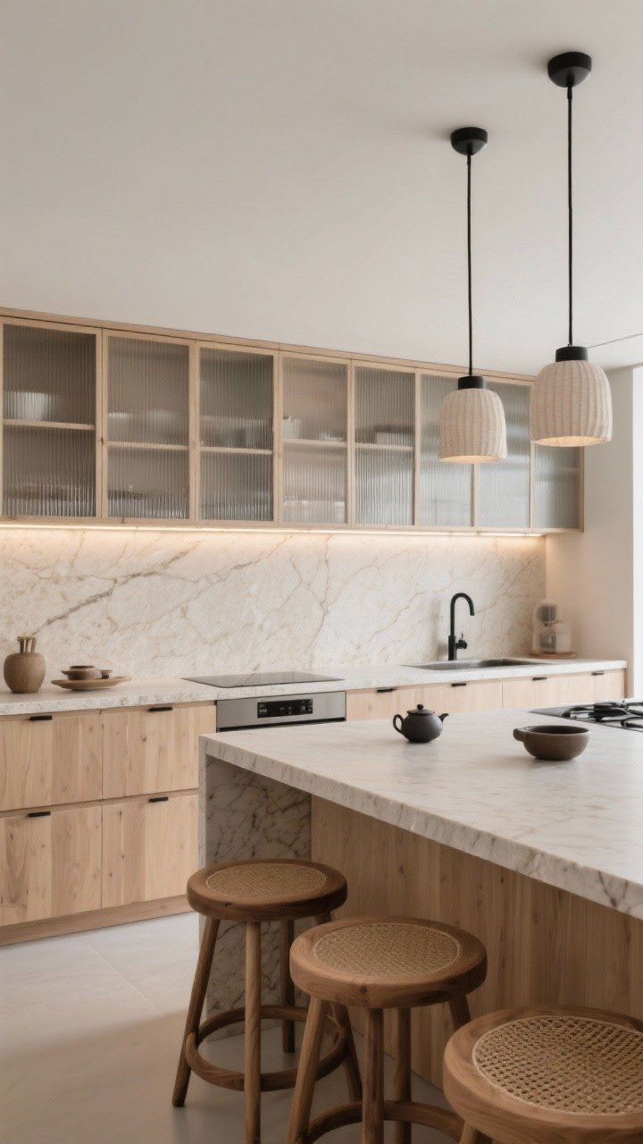 4. Japandi Kitchen With Stone Slab and Reeded Glass