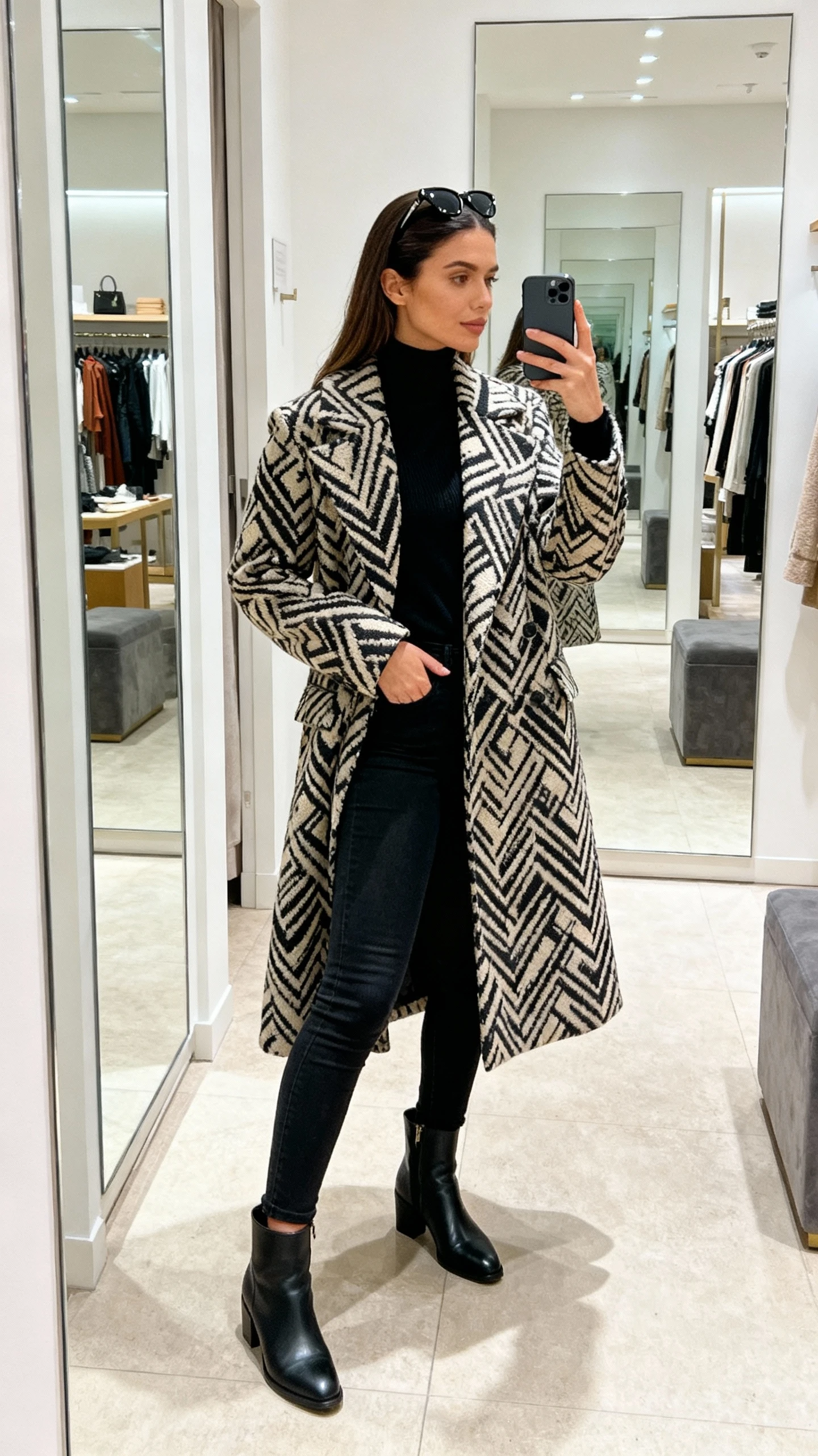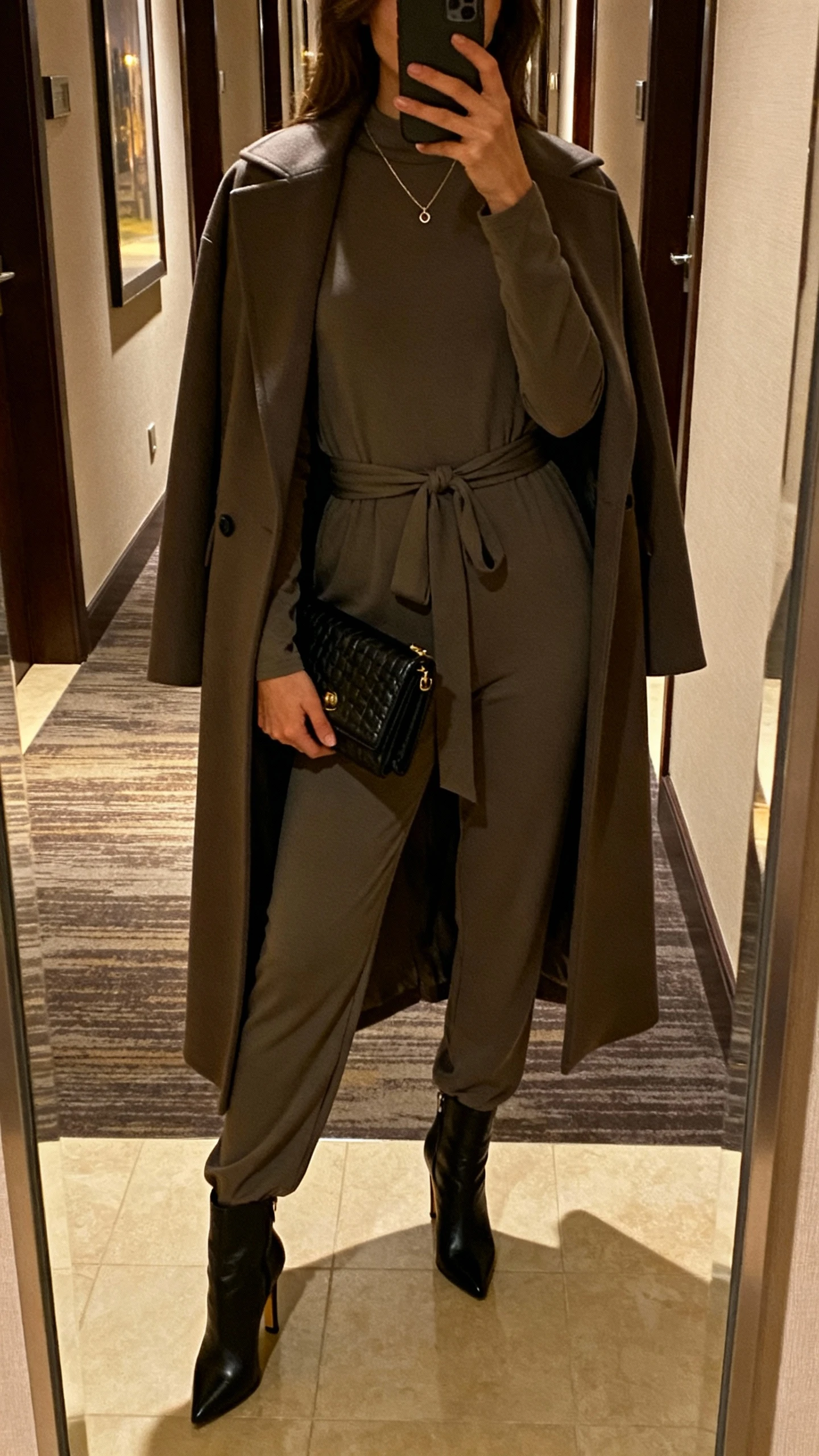 One-and-done dressing that looks like you tried. A tailored jumpsuit under a dramatic coat is sleek, warm, and easy to accessorize. It’s perfect when you want to look pulled together without fussing with separates.