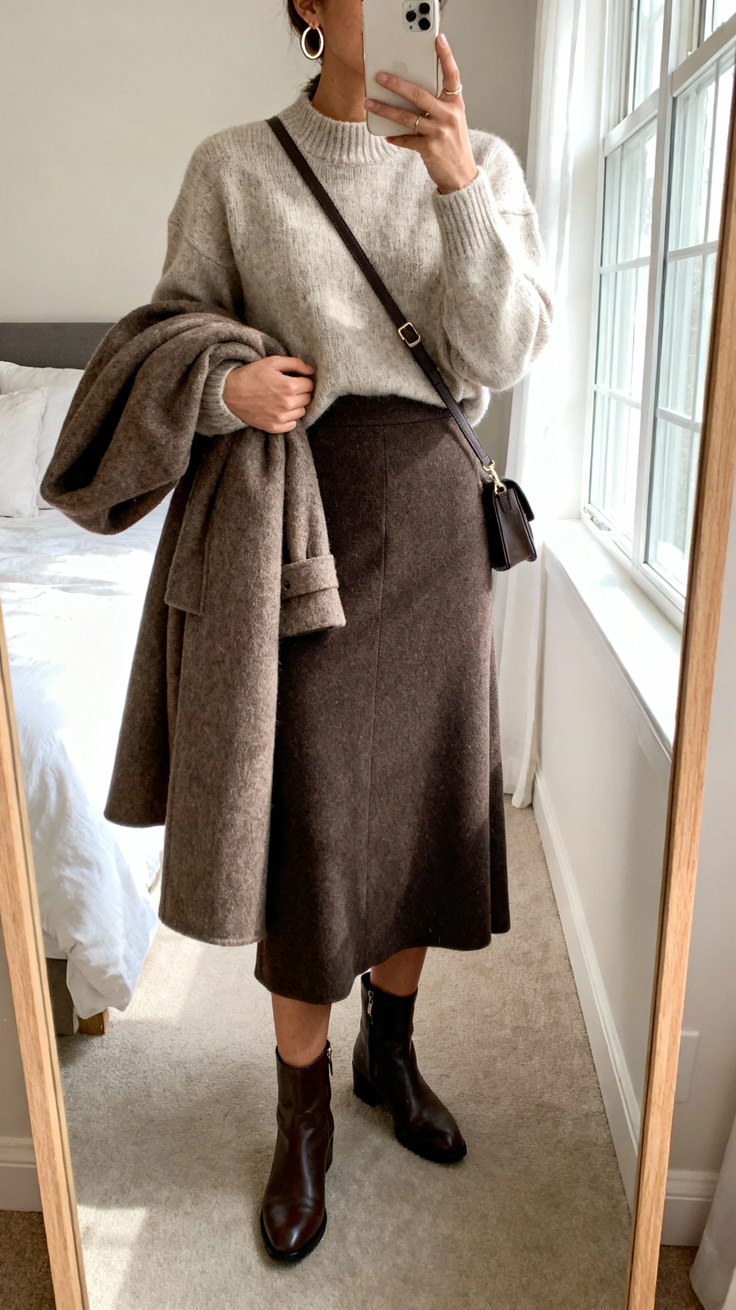 1. Cashmere Sweater + Midi Skirt Magic With Weather-Ready Boots
