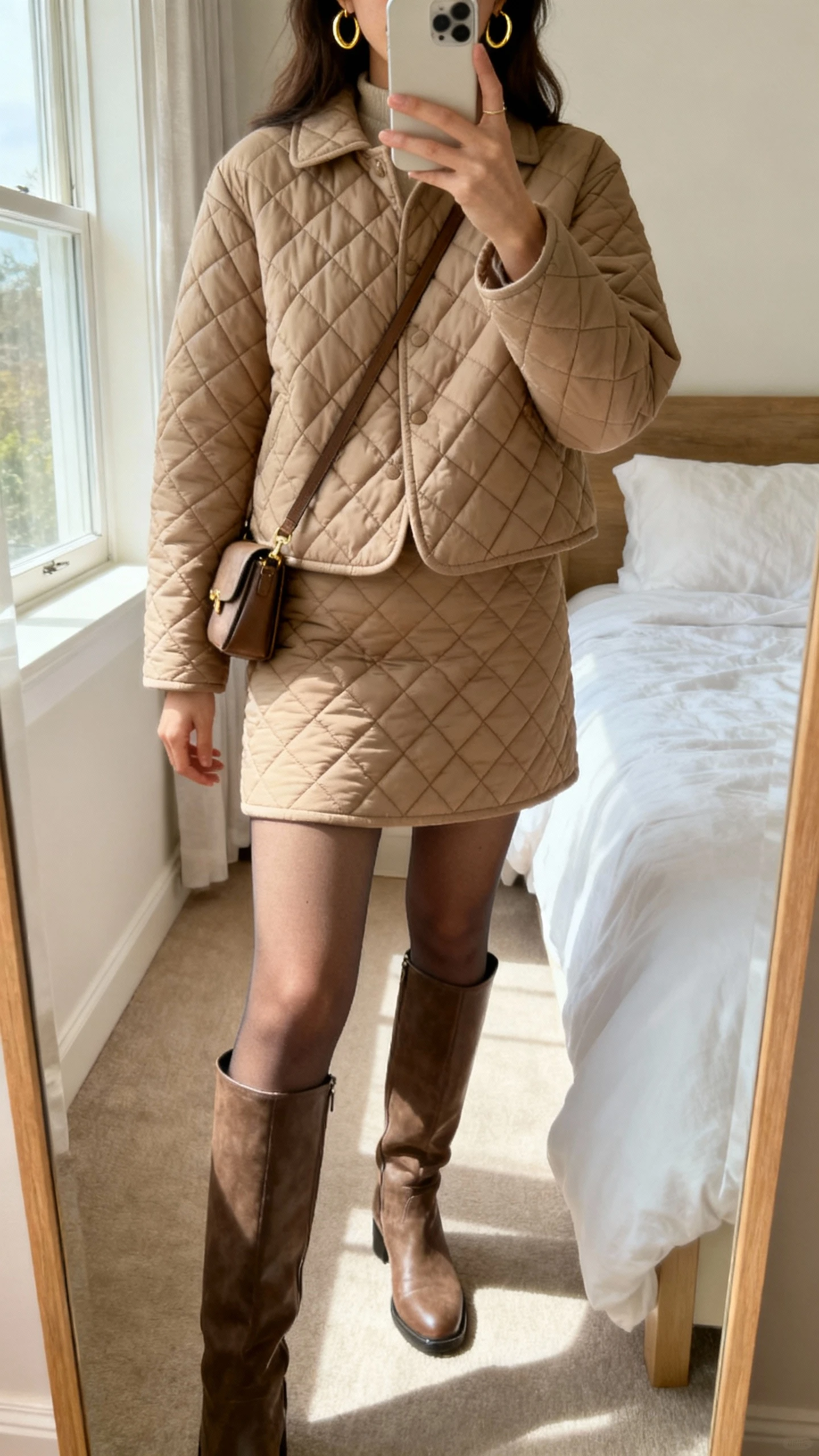 10. Quilted Skirt Set + Knee Boots For Feminine Warmth