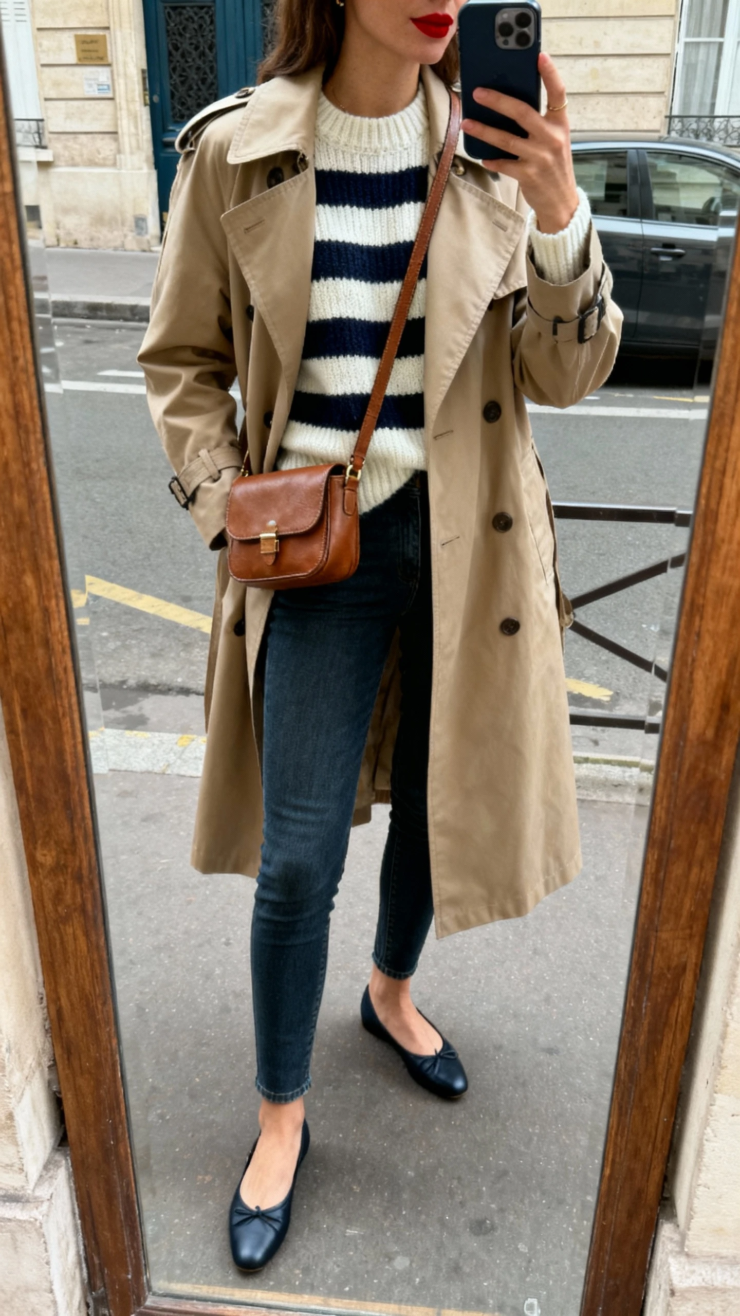 8. Parisian-Inspired: Striped Knit, Trench, And Wine-Ready Red Lip