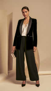 9. Velvet Blazer + Lace Cami + Wide-Leg Pants