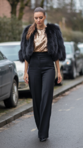 For those nights when you want a little sparkle but don’t want to freeze your shoulders off, this one’s a winner. The sequin top gives party energy, while high-waisted tailored trousers keep it classy. The cropped coat adds just the right structure without covering your shine.