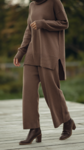 Comfy doesn’t have to mean boring. A matching knit set (like a cozy sweater and skirt combo or knit pants) gives that put-together look without trying too hard.