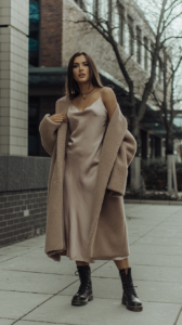 The contrast of delicate and edgy? Chef’s kiss. 🖤 The slip dress gives feminine energy, while the combat boots add grit. Throw on an oversized coat (bonus points if it’s in wool or leather) to pull it all together.