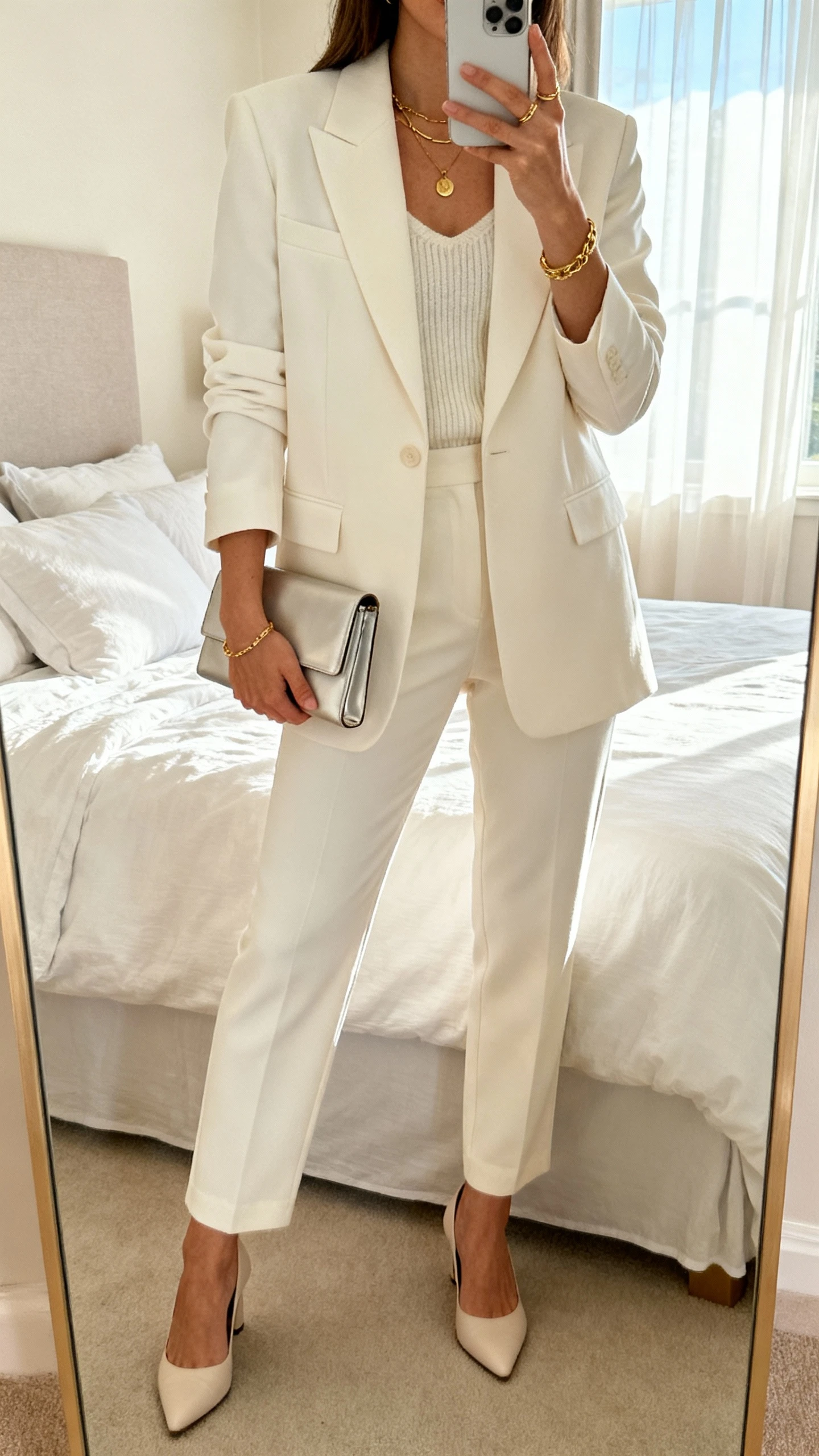 - Monochrome sets in cream, tan, or black look especially sharp.