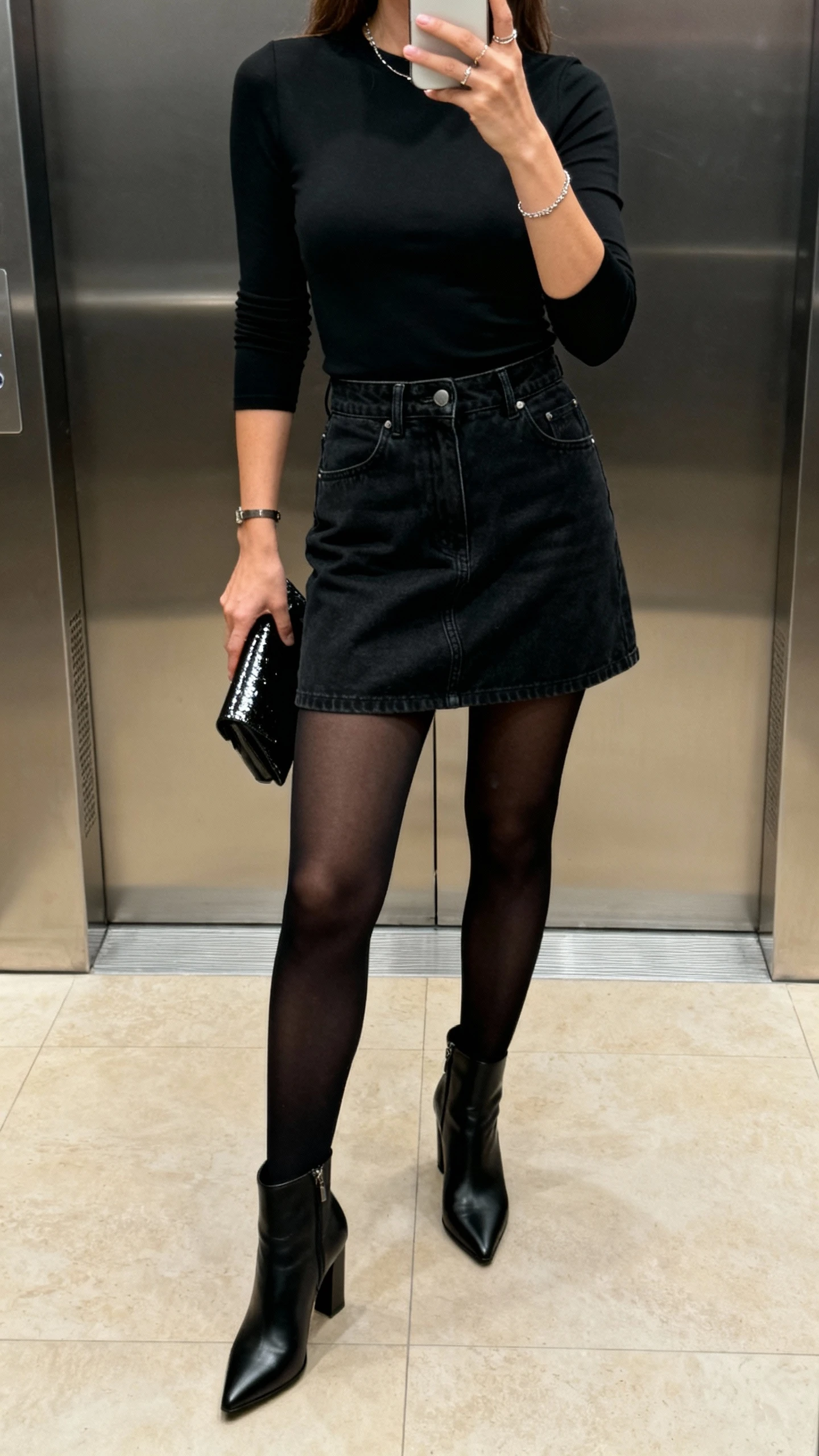 5. Sleek All-Black Denim Skirt Ensemble With a Hint of Shine