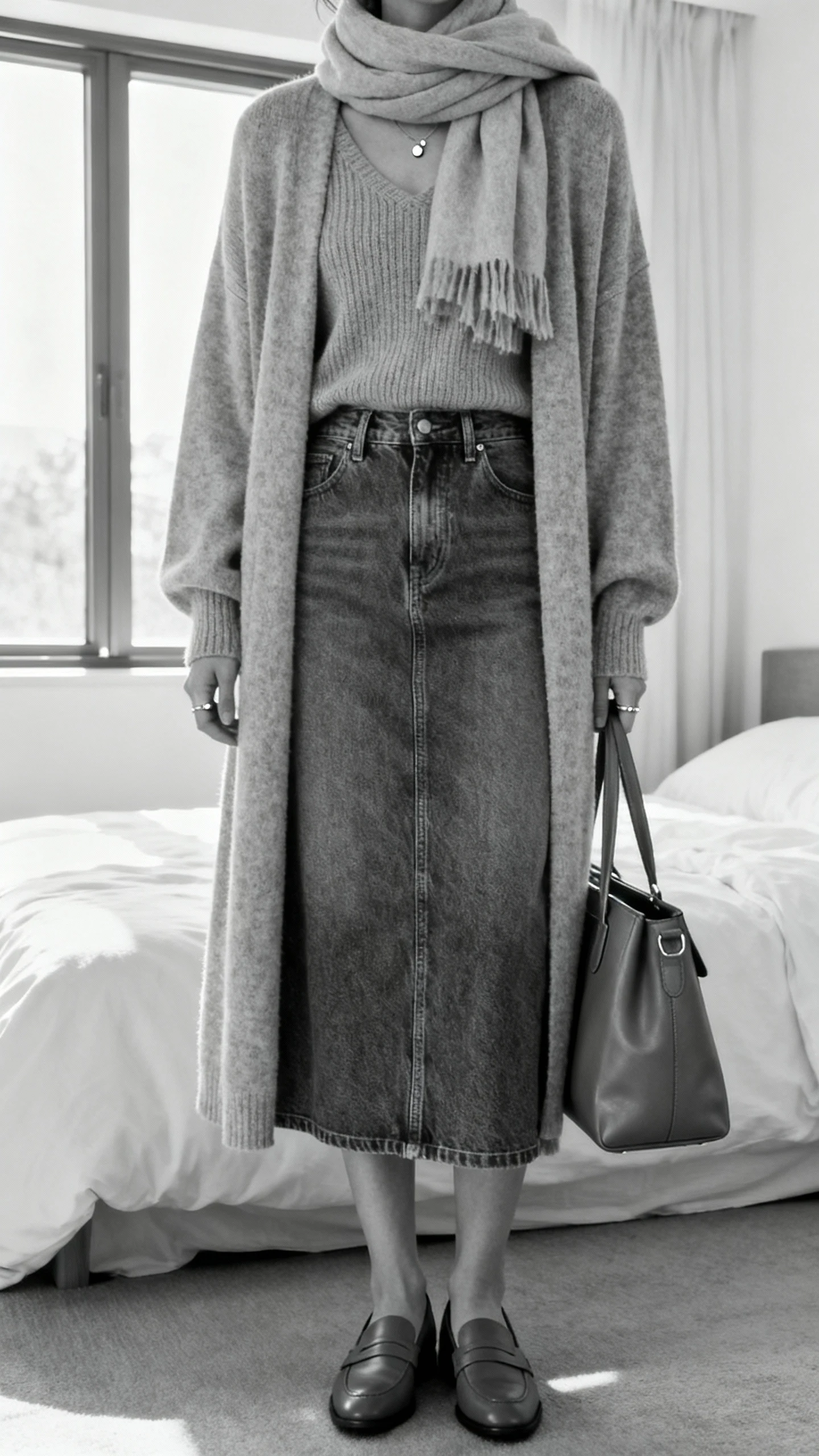 This outfit is soft, elegant, and secretly so warm. A tonal palette (think cream-on-cream or gray-on-gray) paired with a denim midi and a long cardigan looks effortless and expensive. It’s minimalist but not boring—clean lines, plush textures, and cozy layers.